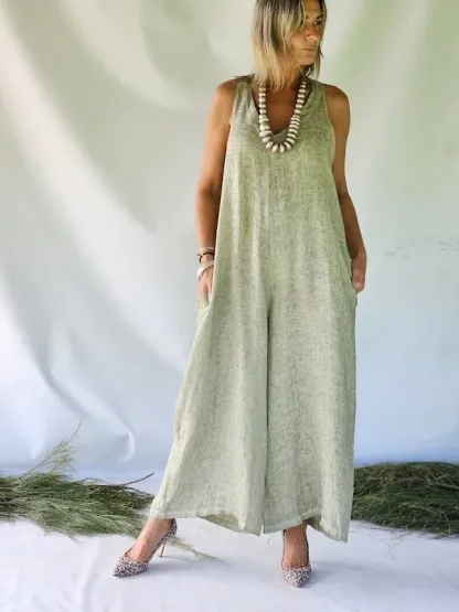 Elevate your casual wardrobe with this chic and comfortable jumpsuit. Its solid color provides a blank canvas for your personal style, allowing you to dress it up with bold accessories or keep it simple for a minimalist look. The V-neckline flatters your figure, while the sleeveless design offers a breezy feel, perfect for sunny days.